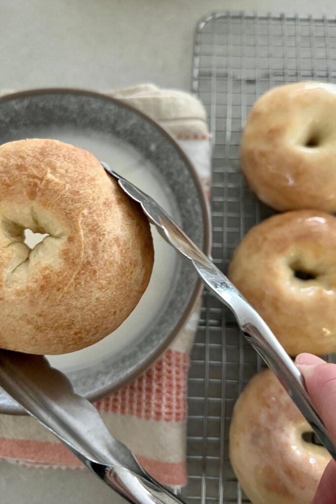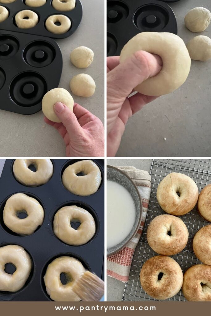 - Roll the dough into balls and then poke your finger through each ball. Gently stretch the dough out so there is a hole in the middle of each one.