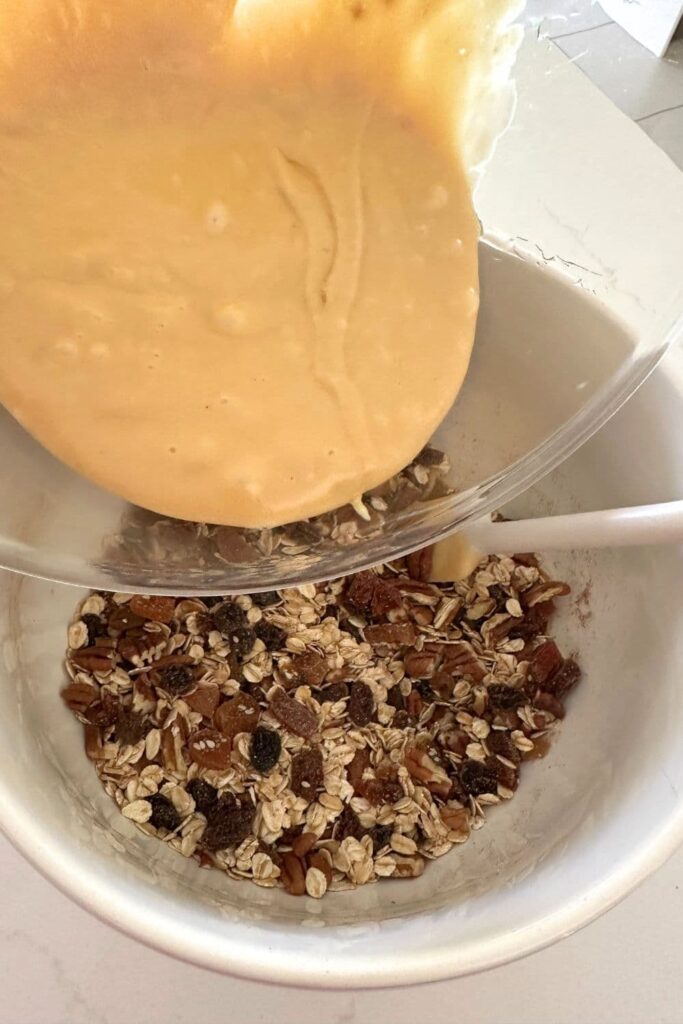 Pour the wet ingredients over the dry ingredients and stir until well combined.