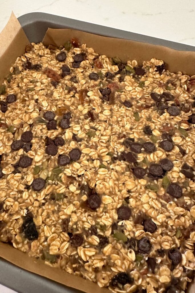Place the granola bar mix into the oven and bake for 30 minutes at 175C (350F) or until the edges are golden and the mix is firm to the touch.