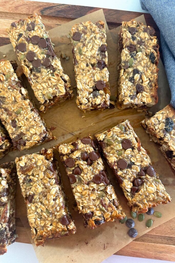 - Allow the granola bars to cool in the tin before using the parchment paper to carefully lift onto a chopping board and slice into bars of your desired size.