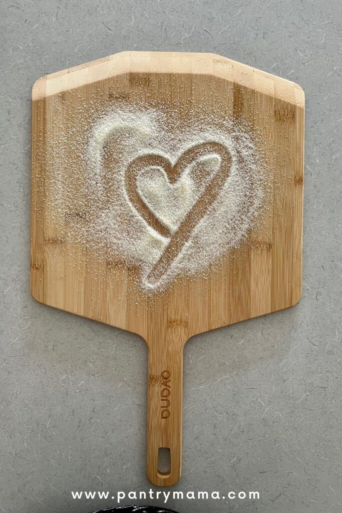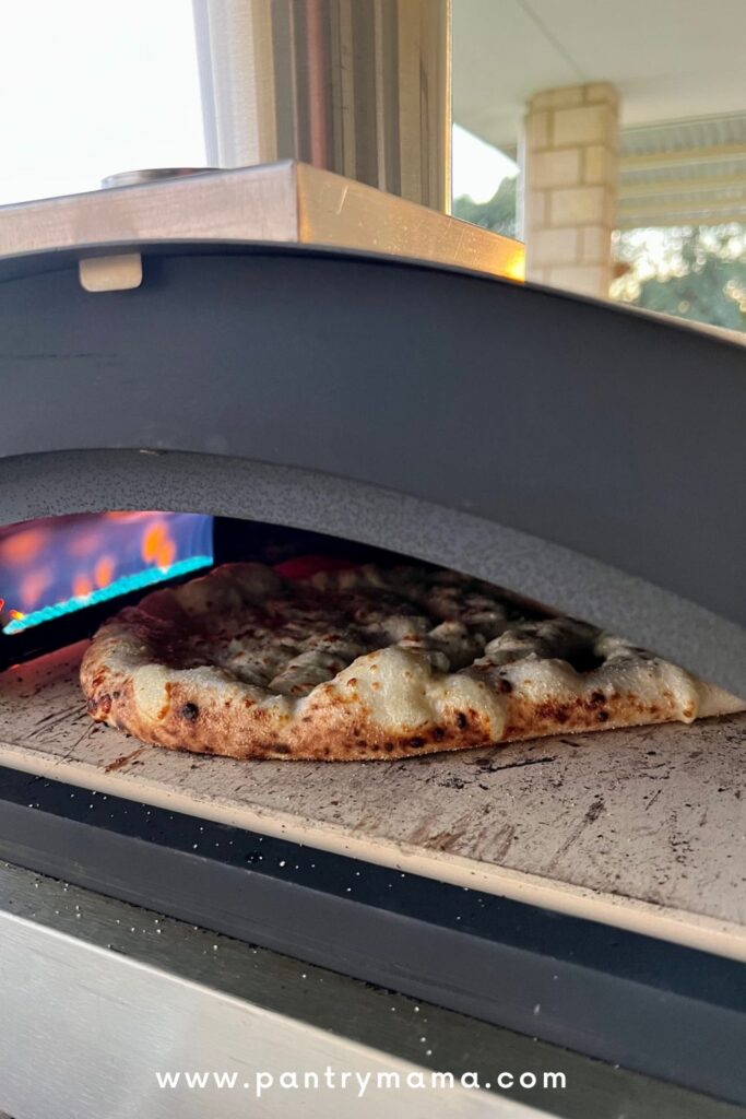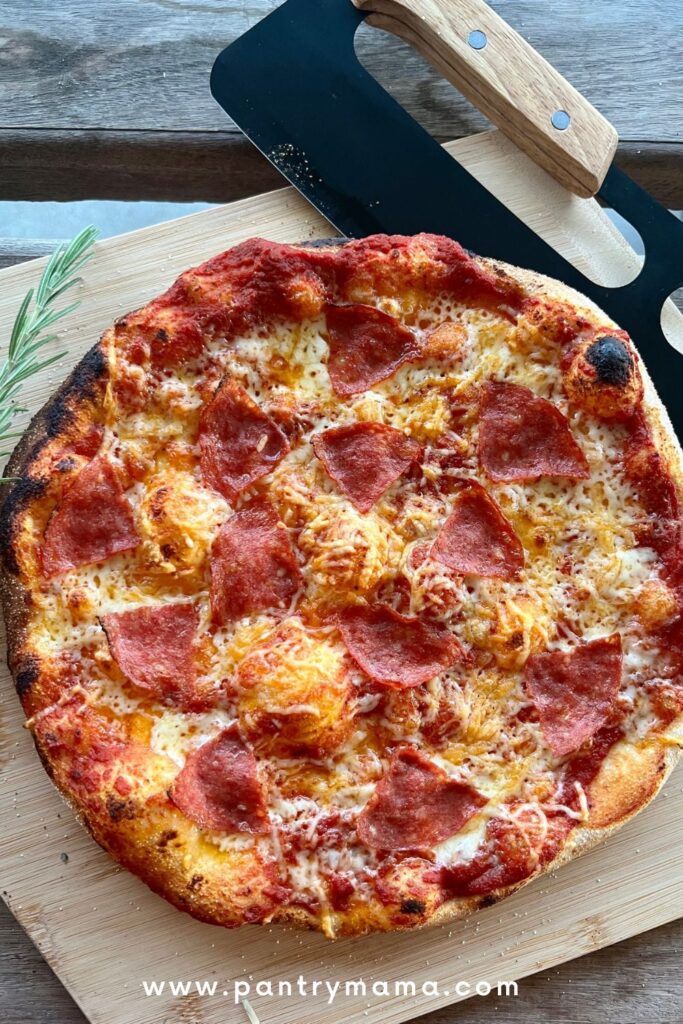 I only ever use bread flour to make sourdough pizza crust. I use a pizza peel generously sprinkled in semolina flour (see more about this below). This ensures that I can easily transfer my sourdough pizza from the peel onto the pizza stone inside my gas fired pizza oven.