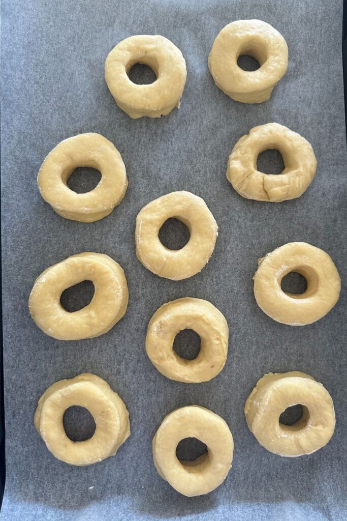 1pm - Use a donut cutter to cut out the donut shapes and arrange the a parchment lined cookie sheet. Cover with a damp kitchen towel and leave them to proof and get puffy.