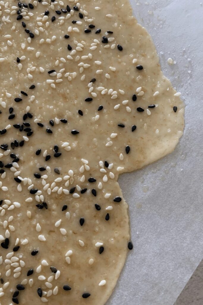 Lavosh is a crisp, unleavened flat bread - the perfect way to use up sourdough discard. These sourdough lavosh are made with whole wheat flour and topped with black and white sesame seeds and good quality sea salt (but you can use other seeds like poppy seeds, pumpkins seeds etc). Their rustic appearance make them super simple to create. These sourdough lavosh are made using olive oil which makes them dairy free.