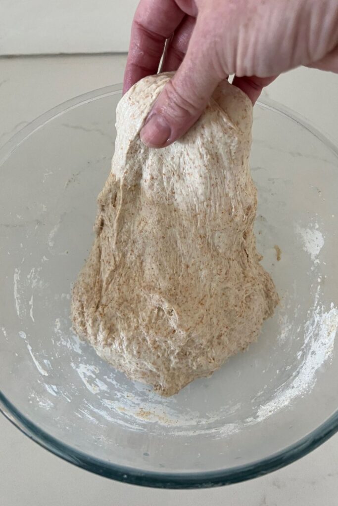 For each set, stretch the dough up and over itself 4 times. Leave around 15 minutes in between each set. Again you do not have to be exact with time, but you need to do at least 4 sets over 2 hours.