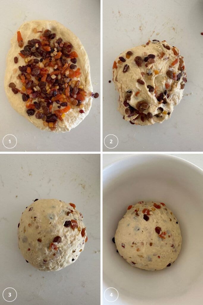 Now, gently knead in all the boozy dried fruit. The fruit should have absorbed all the rum, so there won't be any excess liquid to worry about. Don't worry if the dough tears a little, leave it to rest for 10 minutes, then knead again.