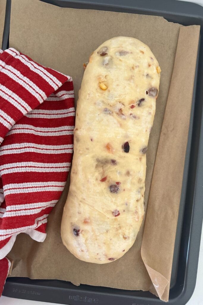 - Transfer each stollen to a baking tray lined with baking paper and cover with a damp kitchen towel. Allow the stollen to proof at room temperature until the dough has risen around 50% again.