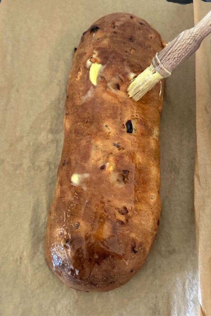- Remove the baked sourdough stollen from the oven and allow to cool for a bit before brushing it all over with melted butter (a pastry brush is perfect for this).