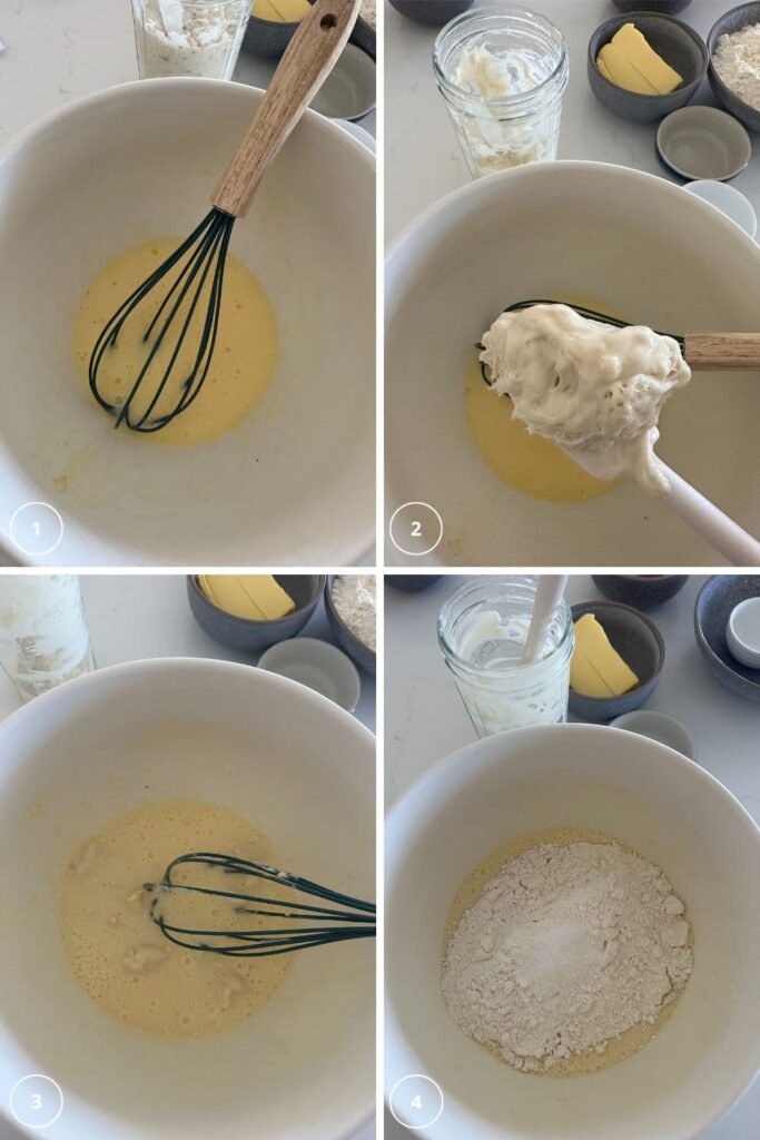- This levain should be prepared the night before. Add the flour, water, sugar and sourdough starter to a jar and mix thoroughly. Set aside to peak.