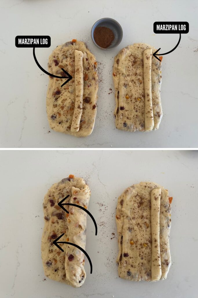 - Gently pull each piece of dough out into a rough rectangle. Mold the marzipan into two long cylinders, the same length as your dough and lay off centre on the long side of each piece dough.