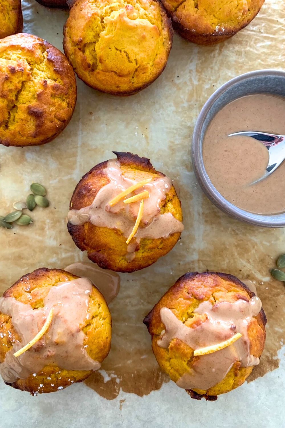 • Sourdough gingerbread muffins topped with sugar glaze and sourdough gingerbread dust