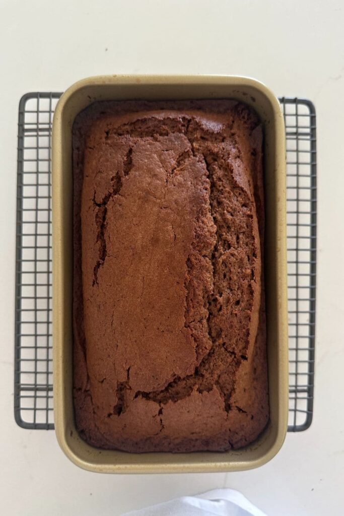 Remove the sourdough chocolate chai loaf cake from the oven and allow it to cool in the tin for around 10 minutes before inverting it onto a wire rack to fully cool.