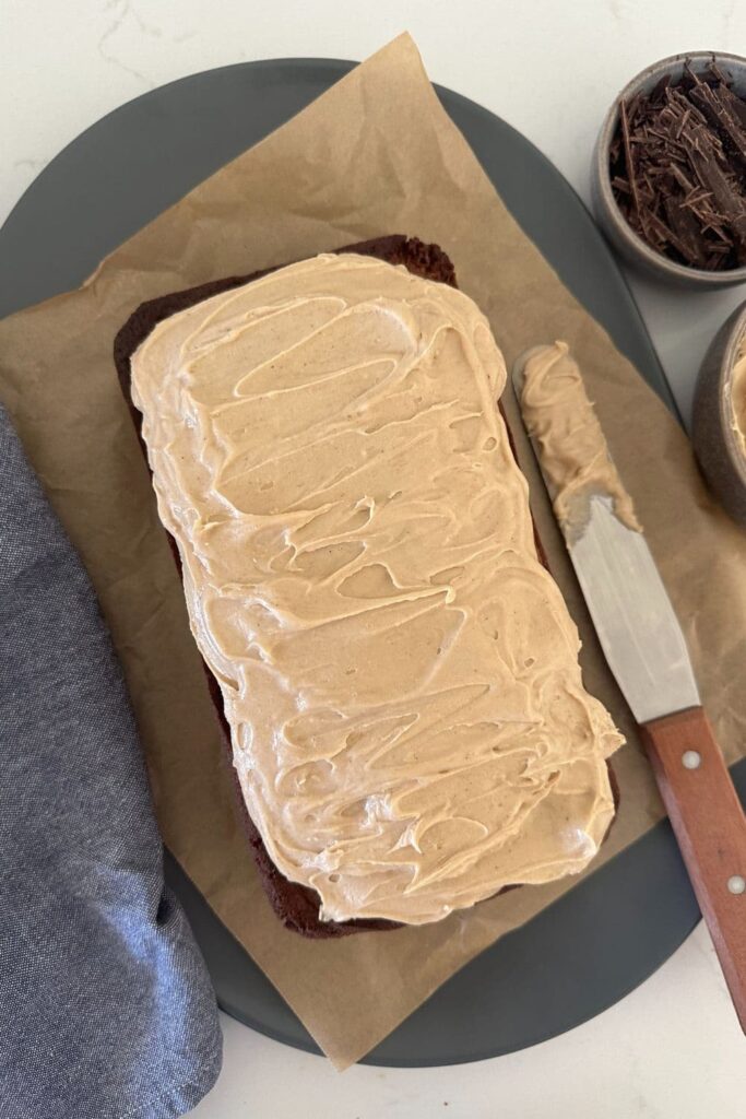 - Spread frosting over cooled loaf cake and sprinkle with chopped dark chocolate if desired.