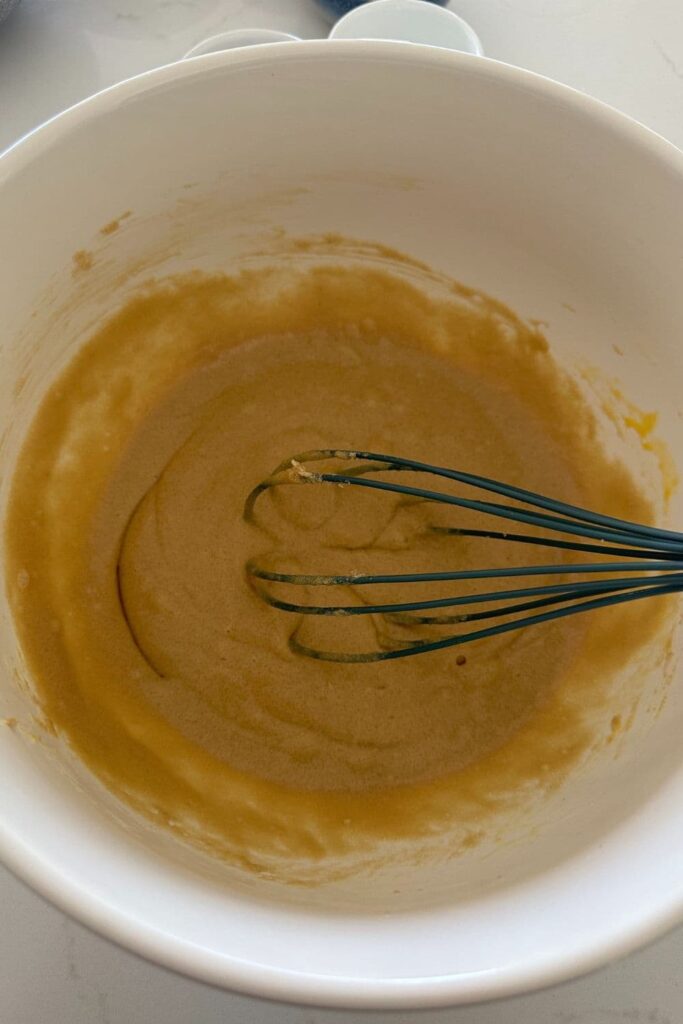 In a large mixing bowl, add the softened butter and brown sugar and whisk together before adding the eggs, vanilla extract, yogurt and sourdough starter.