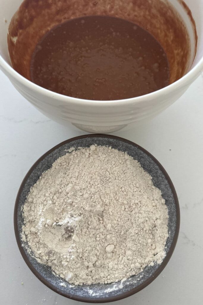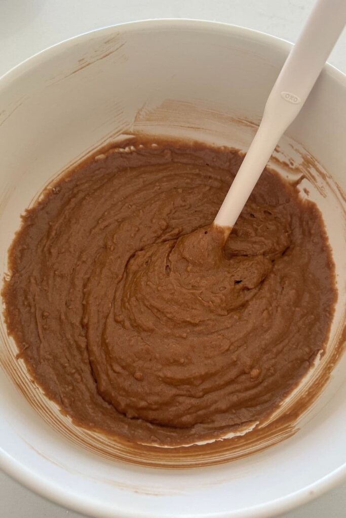 Then add the flour mix on top of the liquid batter and gently fold into each other until well combined.