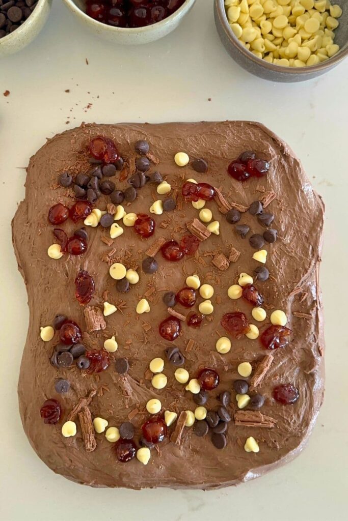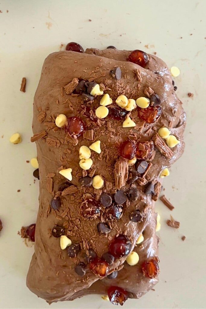 Tip the dough out of the bowl so that the sticky side is facing up. You can pull the dough out into a rough rectangle.It's at this stage that you need to add the additional ingredients. Add handfuls of the chocolate and cherries as you shape the dough.
