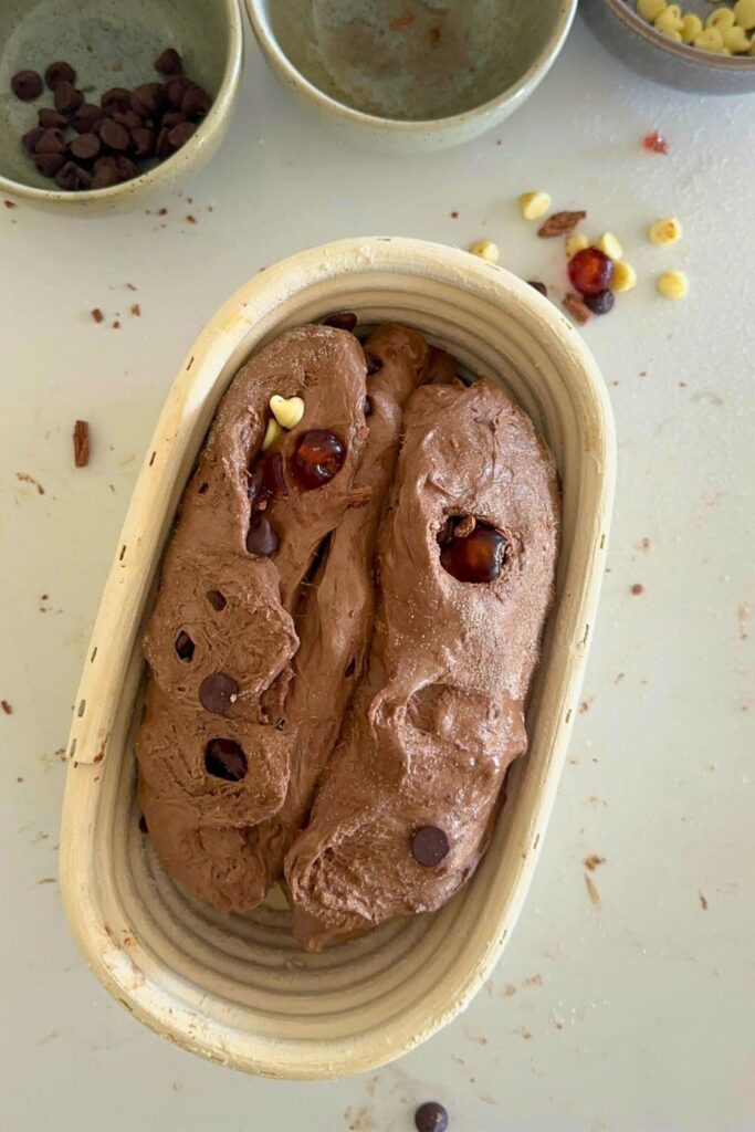 - Shaping Your Dough:Once your dough has finished its first ferment, it's time to give it some shape and surface tension. I think this recipe lends itself to a batard however it's completely up to you what shape you would like. You can see me shaping a batard here.Tip the dough out of the bowl so that the sticky side is facing up. You can pull the dough out into a rough rectangle. It's at this stage that you need to add the additional ingredients. Add handfuls of the chocolate and cherries as you shape the dough. You can see how I've done it in the photos above.Shape the dough into your desired shape and then gently place it into your banneton, stitching the base if necessary. The flavor additions will make the dough quite hard to pull together so let the dough relax for 10 minutes or so and this should allow the gluten to relax enough and allow you to stitch the base together.