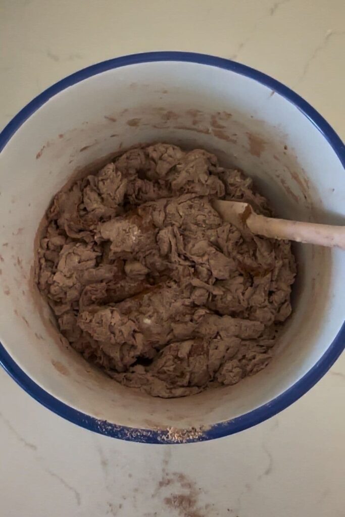 Mix the cocoa powder, salt and flour together and then tip this on top of the water and sourdough starter. Mix together into a rough dough. The dough will be fairly shaggy and only just brought together.