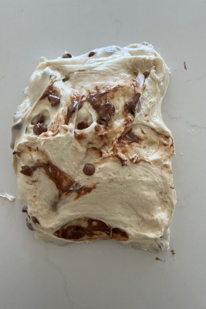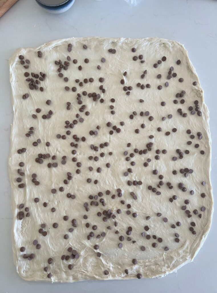 Sprinkle the chocolate chips evenly over the dough and then roll it up into a log and place back into the bowl for bulk ferment.