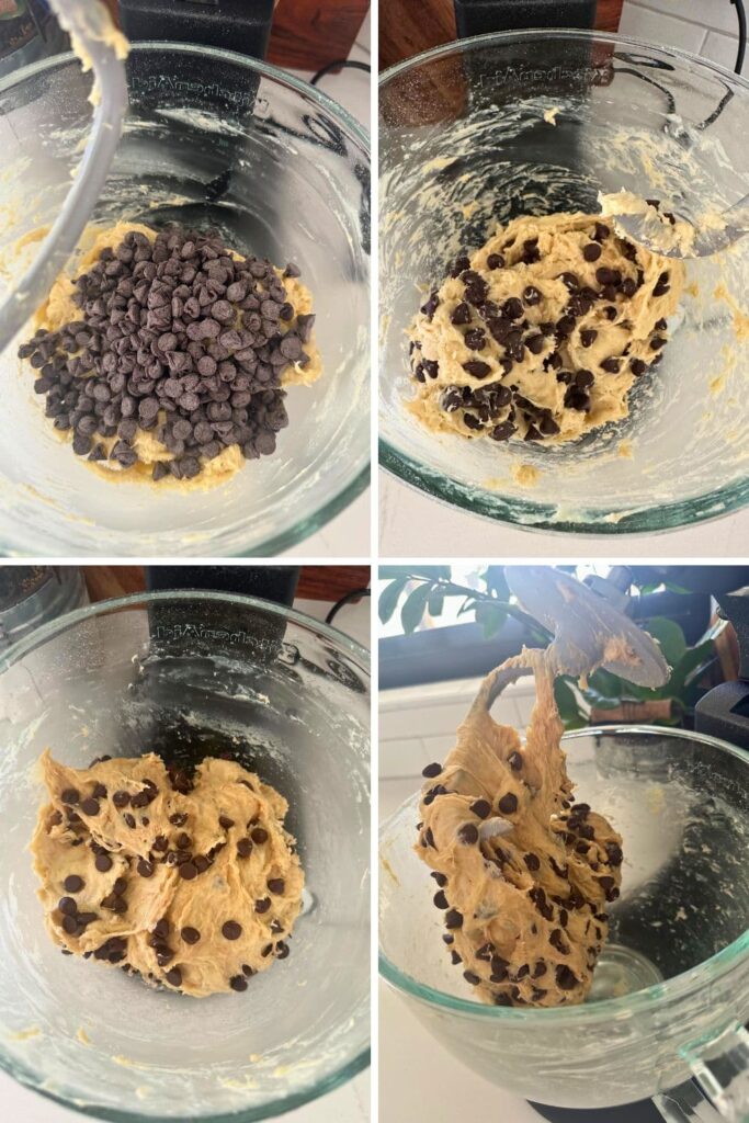 Once the dough is silky and elastic (it can be slightly sticky) it should be pulling away from the sides of the bowl, it's time to add the chocolate chips and ensure they are mixed through the dough evenly.