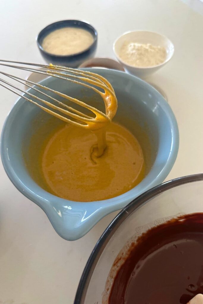 - Now, add the eggs and egg yolk, vanilla extract and brown and white sugars to a batter jug and whisk together until they are smooth and glossy (like runny caramel). Set this aside.