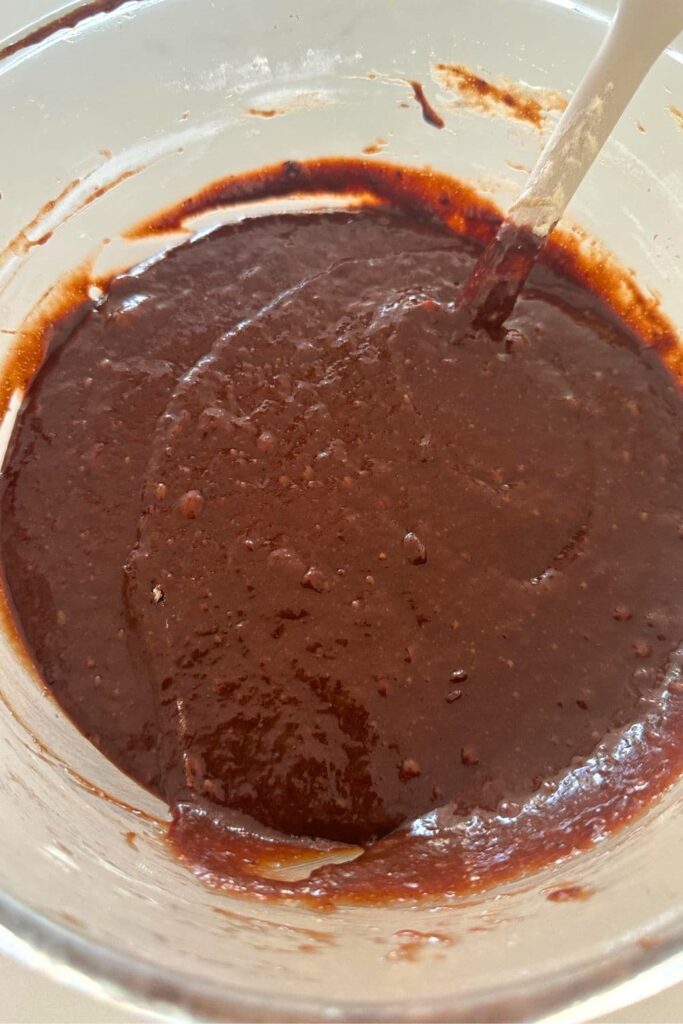 Using a spatula, fold it all together until it's thick and glossy. The mixture will be marshmallowy because of the sourdough starter.