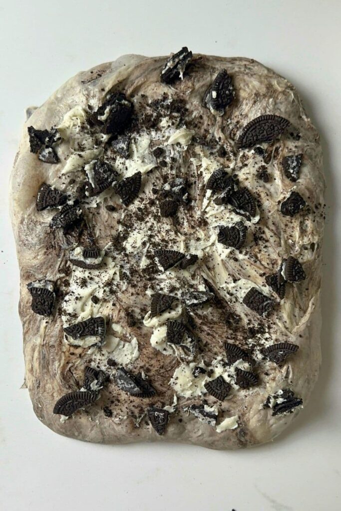 Stretch your dough out into a rough rectangle and spread it with some of the Oreo cream. Sprinkle over some crushed cookies and some Oreo pieces. Fold the top down and repeat the process. Tuck the sides in and repeat the process until you've used up all of the Oreo cream, crumbs and pieces.