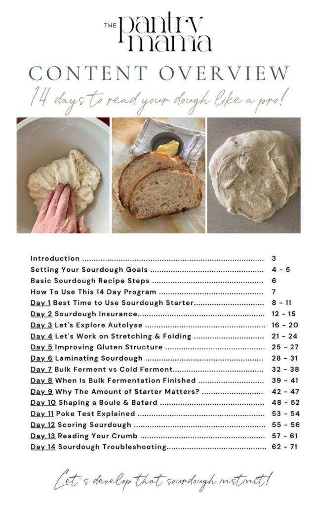 You'll find 14 days of information and activities to help you understand the sourdough process at a deeper level. You will see why your dough is behaving the way it does and what is giving you the results you're getting.