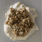 You want to pull the edges of the dough into the centre and then flip it over so that the sticky side is now underneath. Using the stickiness, gently pull the dough into a tight ball.
