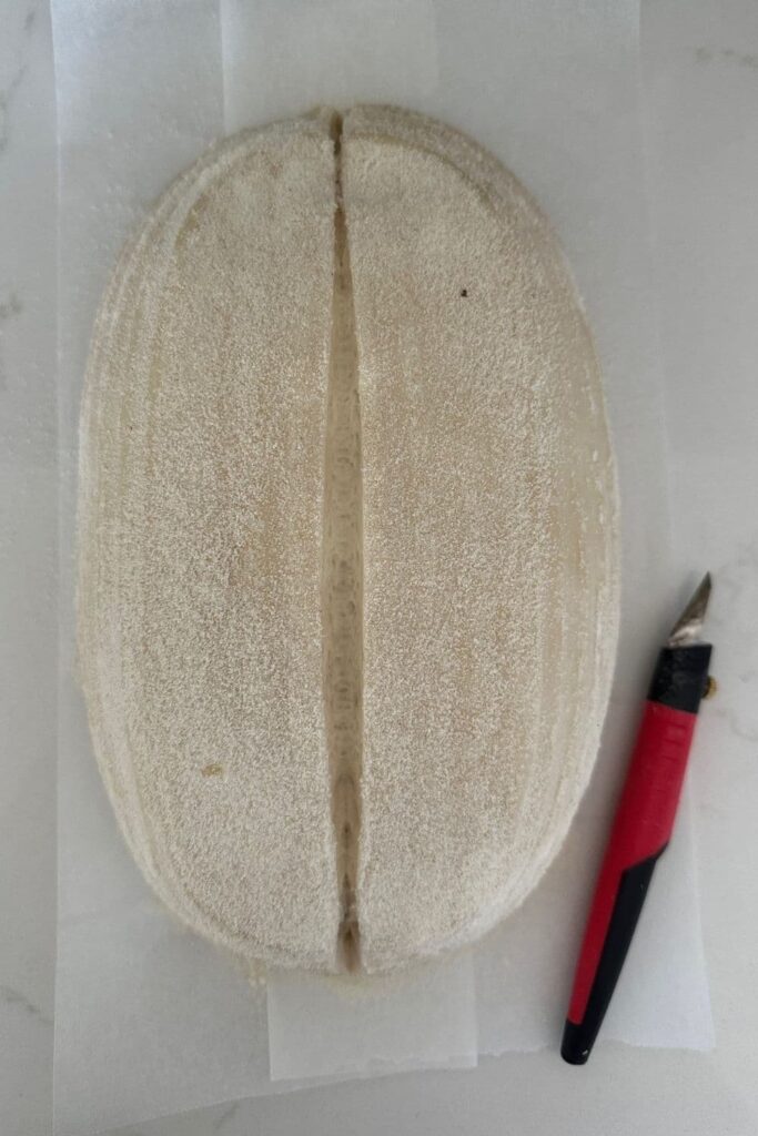 Gently score your bread with a lame, clean razor blade or knife. At minimum a large cross is sufficient, but you can get as artistic as you like. You can find my full guide on how to score sourdough bread here.