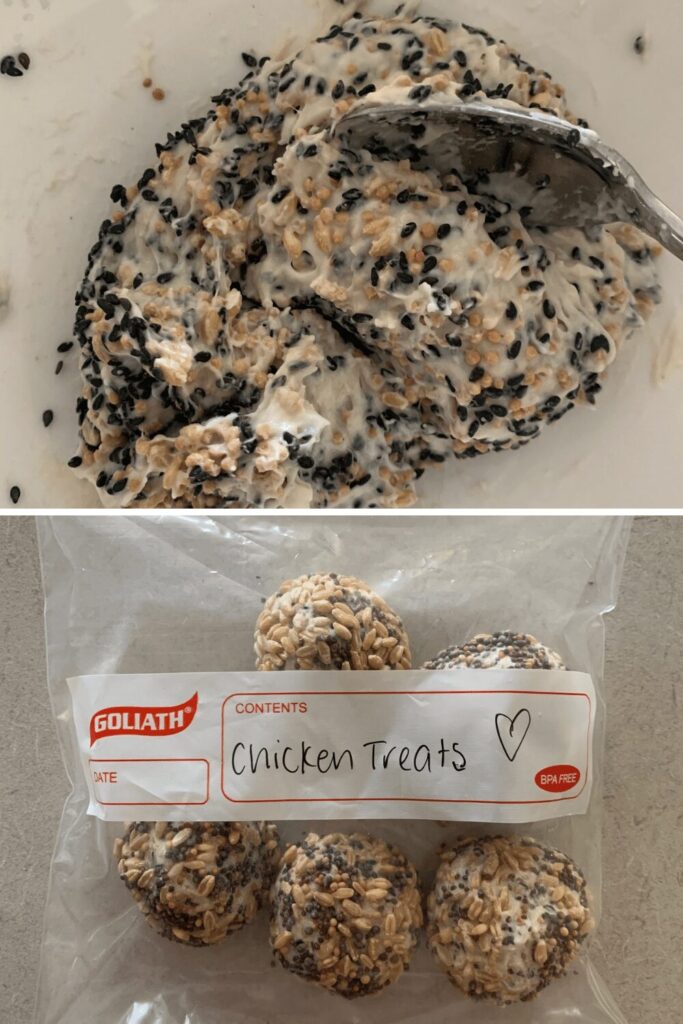 Mix 125g of sourdough discard with 75g of mixed seeds (I used wheat, mustard and black sesame) until it can be rolled into balls. Roll the balls in extra seeds and then freeze. Once frozen, they can be stored in a ziploc bag until needed. Then just toss a few in your chicken yard for a fun frozen treat.