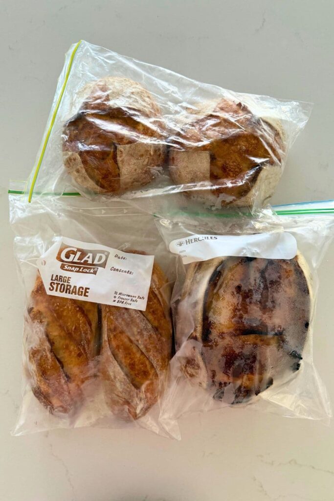 In creating this post, I have tested many methods of freezing sourdough bread, from wrapping in aluminum foil, beeswax wraps, freezer bags, plastic wrap, ziplock bags, as well as combinations of these. And you know what I find to be the easiest and most effective way of freezing sourdough bread? A ziplock bag!