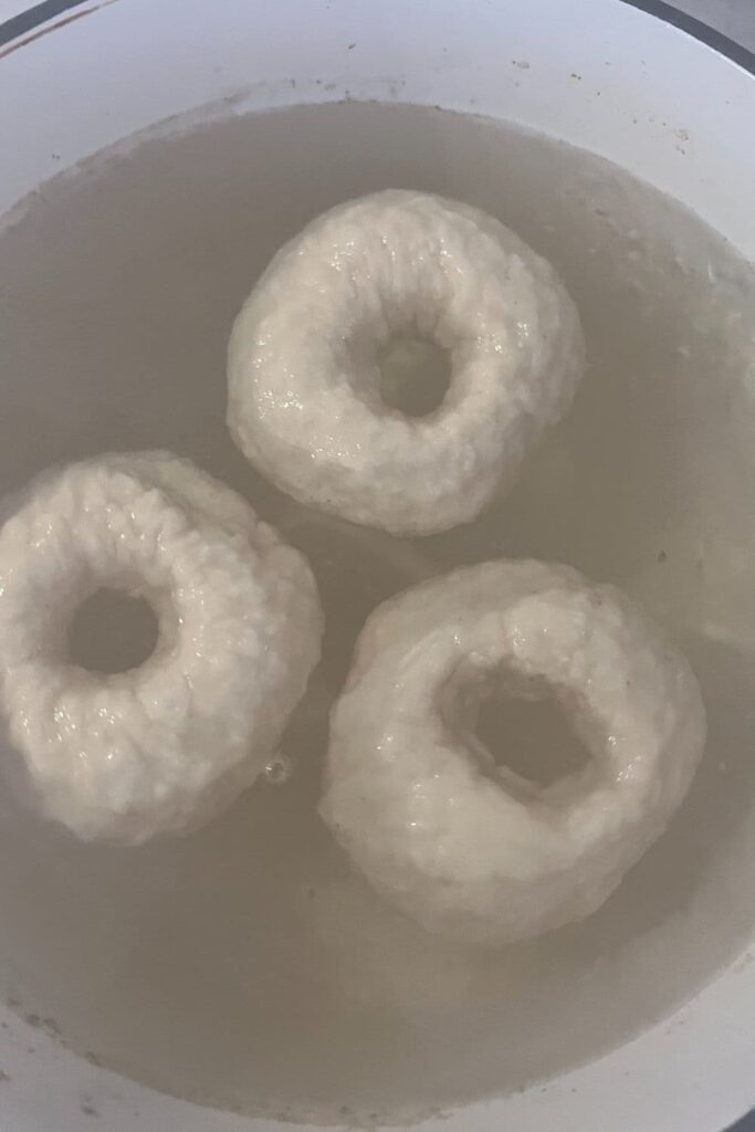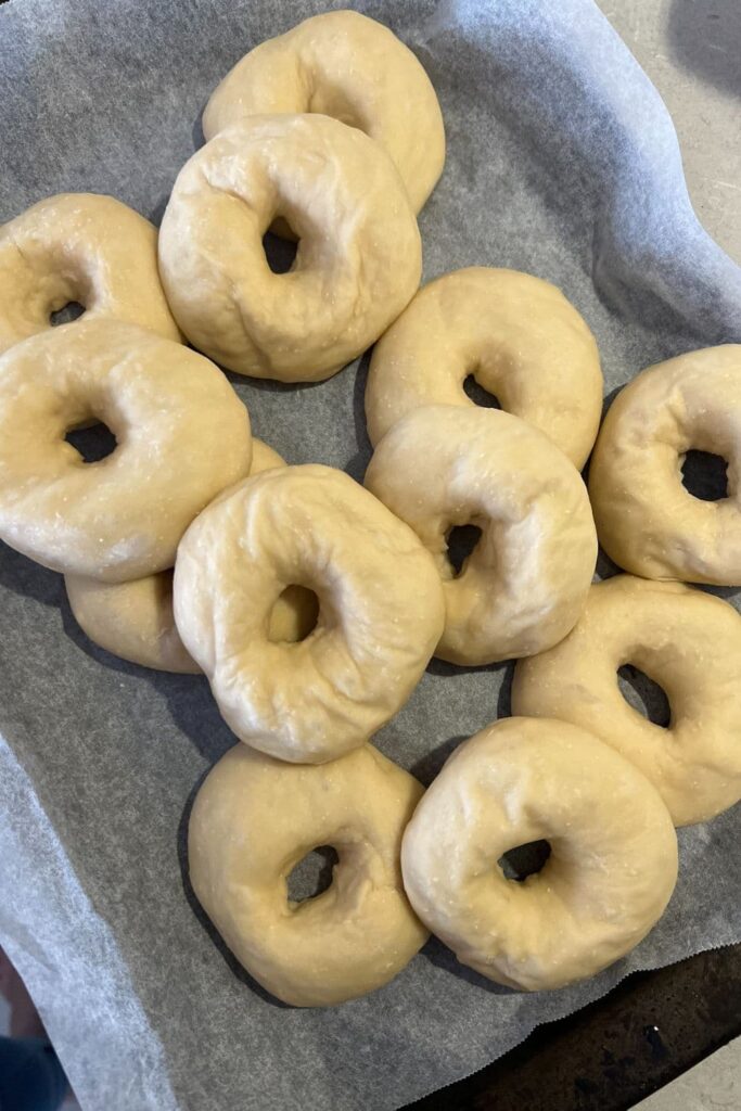 - Cover the bagels with a dish cloth and allow them become lovely and puffy.
