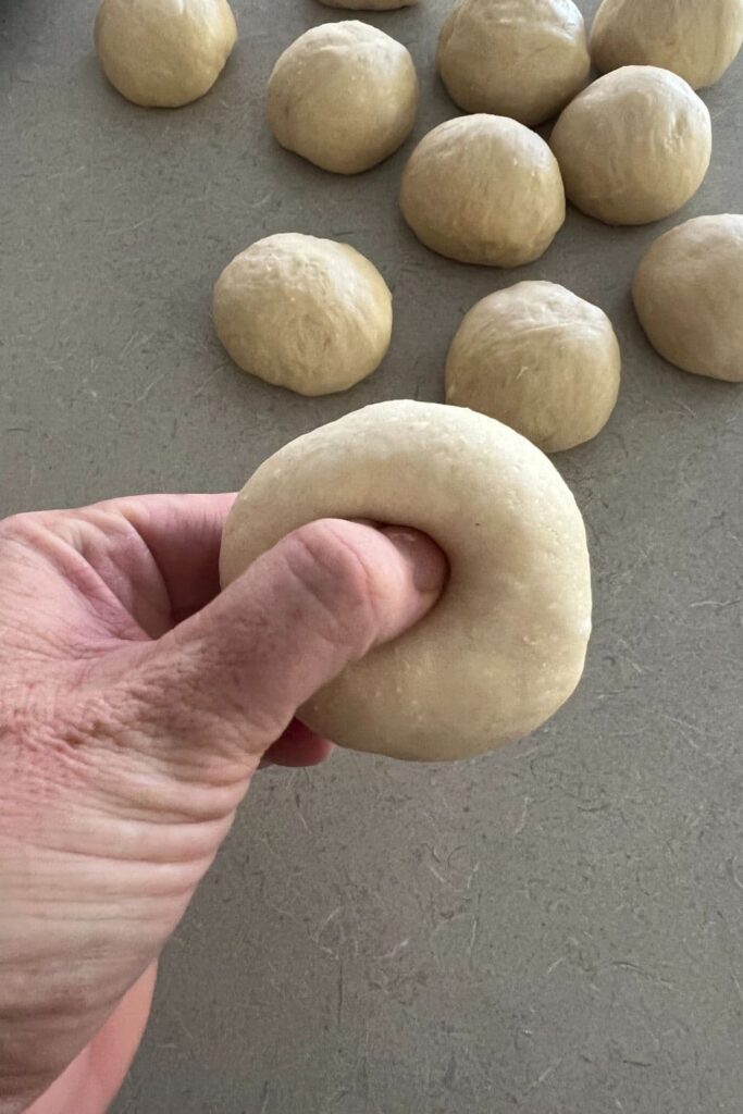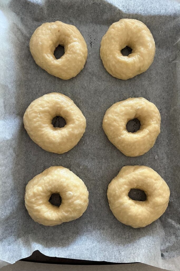 - Take each ball and poke a hole in the middle. Gently stretch the hole out and then place each bagel on a sheet of baking paper to rise.