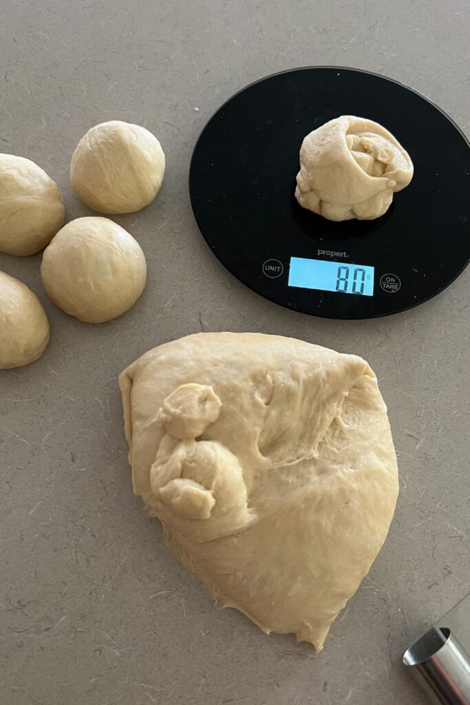 - Once the dough has risen, you'll need to shape the bagels. It's quite simple, you just need a little patience.Divide the dough into 11 pieces weighing 80g each. Shape each piece of dough into a small ball.