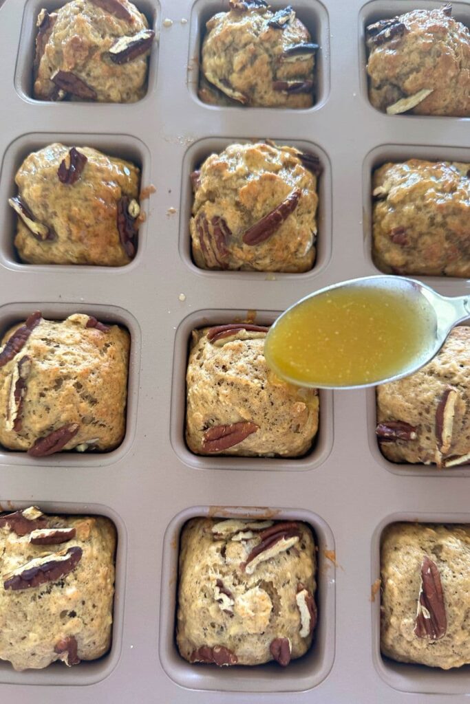 - Remove sourdough maple pecan muffins from the oven and while they are still in the muffin pan, drizzle with the maple butter syrup you prepared earlier. Allow to sit in the pan for 10 minutes before transferring to a wire rack to cool completely.