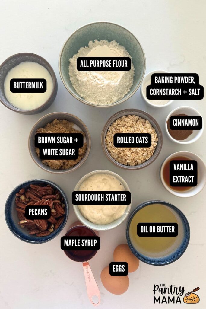 This sourdough maple pecan muffin recipe uses really simple ingredients, most of which you probably already have in your pantry. Let's look at exactly what you need (exact amounts and directions can be found on the recipe card at the end of this post).