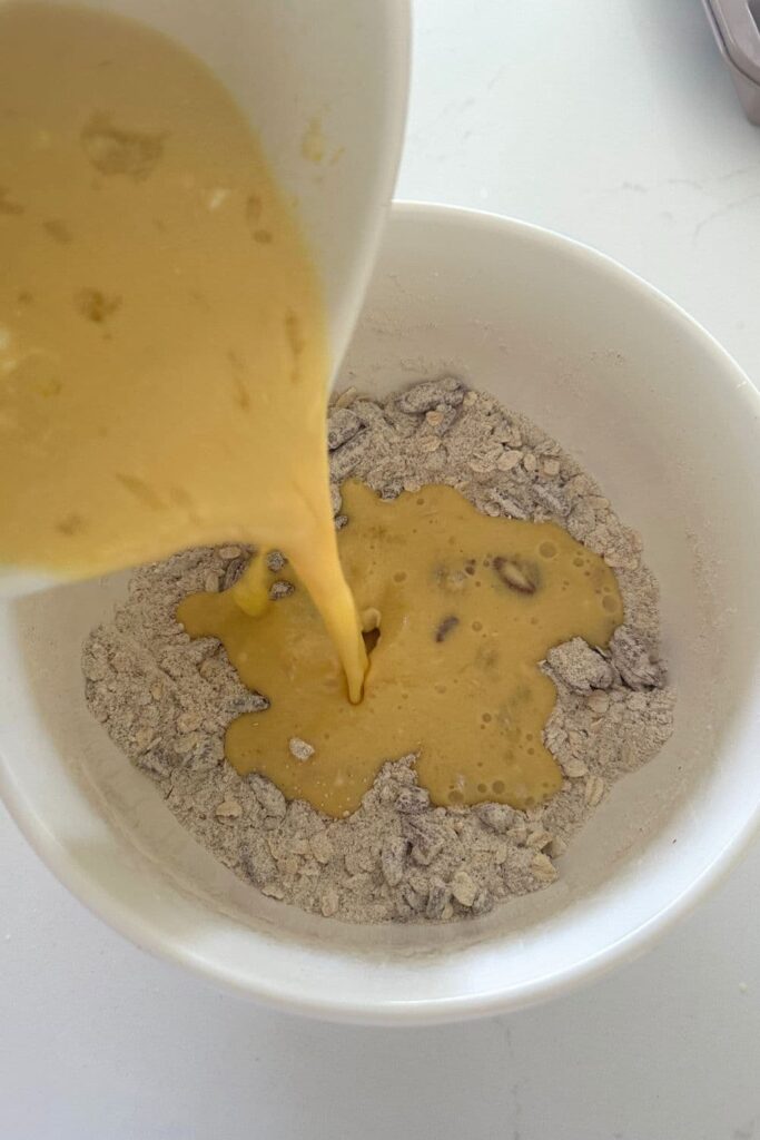 - Now pour the wet ingredients into the bowl with the dry ingredients and stir to combine. Don't over mix, just stir enough to wet the dry ingredients.
