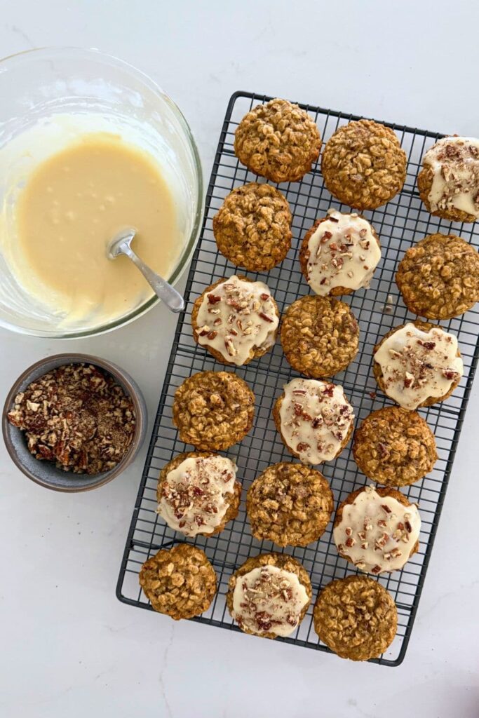 A whole batch of maple pecan sourdough oatmeal cookies with maple butter glaze on a wire cooling rack.