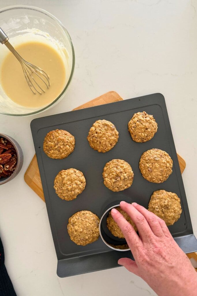 7. Glaze – Whisk powdered sugar, water, maple syrup, melted butter, and salt until smooth. Drizzle over cooled cookies and sprinkle with pecans.