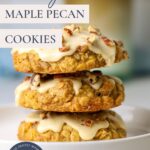 A stack of 5 maple pecan sourdough oatmeal cookies frosted with maple butter glaze sitting on a white plate. There is a pale blue napkin in the background.