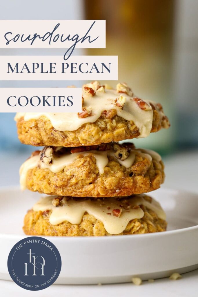 These sourdough maple pecan oatmeal cookies are chewy, nutty, and perfectly sweetened with rich maple syrup. Topped with a luscious maple butter glaze, they’re a cozy treat with crisp edges, a soft center and a delicious sourdough tang from overnight fermentation.