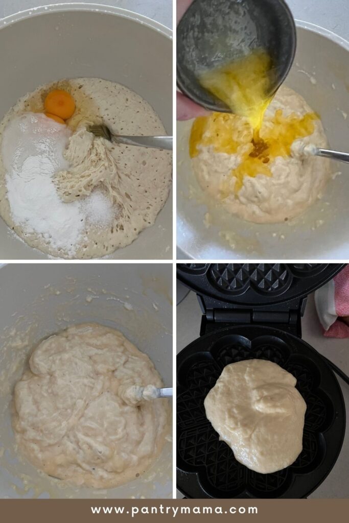 - Add 2 eggs, melted butter, salt and baking powder to the sourdough starter mixture and whisk until the mixture forms a batter.Because the starter has fermented overnight, the mixture will be quite stretchy compared to a regular waffle batter.