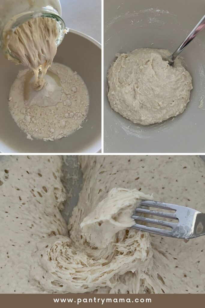 - In a large mixing bowl add sourdough starter, flour, milk and sugar. Stir until it forms a thick dough (it will be the consistency of when you first feed your starter.
