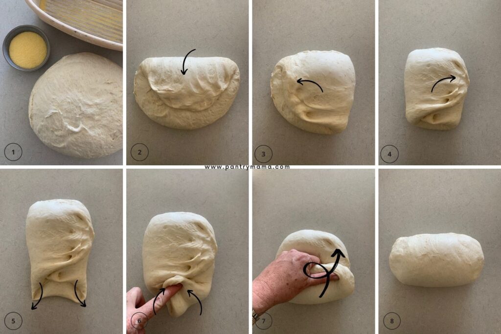 Here's a diagram to show you how to easily shape the bread. At the end, you want to use your hands to pull the loaf towards you and create lots of surface tension.
