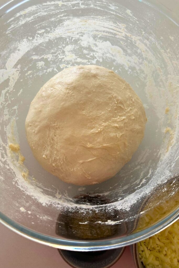 Work your way around the bowl, grabbing the dough from the outside, stretching it up and over itself until a smooth ball is formed.