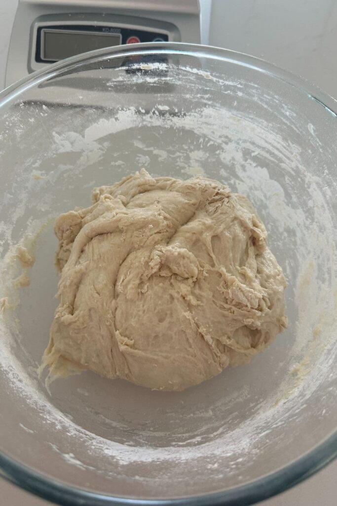 - Pre Mix & Autolyse:Weigh out your starter and water in a glass or ceramic bowl. Mix them together.Then add your flour and salt and mix altogether with a spatula. The dough will be fairly shaggy and only just brought together.Cover your bowl with cling film or a damp tea towel and let it sit for around 1 hour.