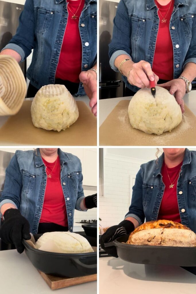 This is a sample baking timeline for making a pesto mozzarella sourdough loaf. You will need to adjust the times to suit your own temperature and environment, but this timeline works well for my sourdough starter and kitchen temperature.