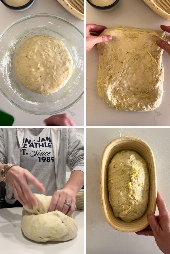 - Stretch & Fold - Creating Structure:You need to add the pesto and mozzarella to your dough during the stretch and fold phase. It's very easy to do! Try to add them around the second or third set of stretch and folds. So do your first set of stretch and folds with the dough as is and then add the pesto and mozzarella on the second (or third) set depending on how your dough is behaving. Remember that the pesto is quite wet and oily so it will make your dough fairly squishy to start with, but don't worry, as you stretch and fold the dough, it will work into the dough and your dough will feel normal again.Try to do around 4 sets of stretch and folds with around 15 to 30 minutes between each set.