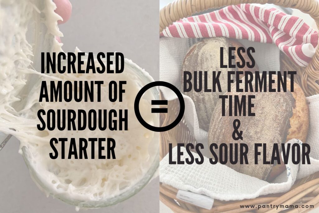 Along with temperature, the amount of starter you use needs to increase too. Now increasing the amount of starter you use will also decrease the sour flavours in your loaf.