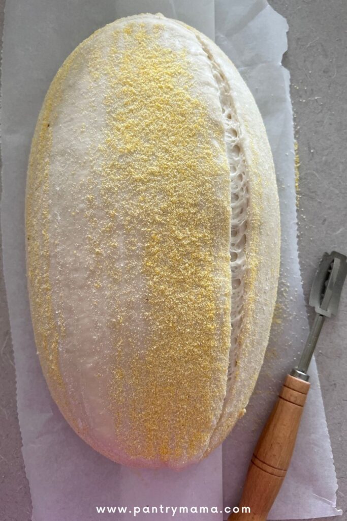 Gently score your bread with a lame, clean razor blade or knife. At minimum a large cross is sufficient, but you can get as artistic as you like. You can find my full guide on how to score sourdough bread here.